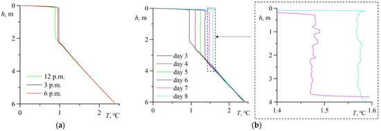 Depthwise temperature profiles: (a) horizontally averaged profiles at different hours of the 3rd day of calculations (Variant 1); (b) instant temperature profiles at 3 p.m. (Variant 1) for days 3 to 8.