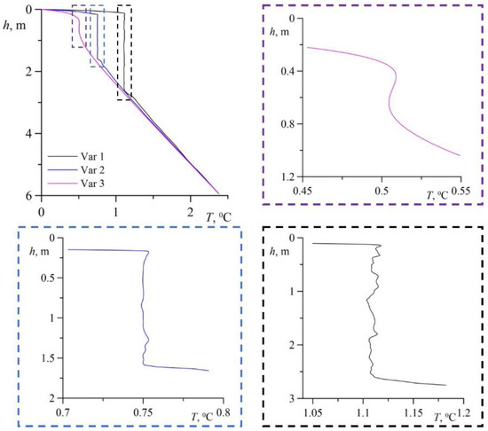 The influence of the radiative intensity on CML evolution can be seen in Figure 6, where depthwise temperature profiles are shown for the same day and time, and for the different variants of energy pumping. One can see that in Variant 3 (with the lowest energy pumping intensity) the CML has the smallest depth, and its temperature profile is noticeably non-monotonous; similar profiles were observed before the emergence of the CML—such profiles are gravitationally unstable. The enlarged temperature profiles in Figure 6 show also that the temperature deviations inside the CML (due to the turbulent motion) are relatively small (for Variant 1 on day 4 they are less than 0.02 °C).