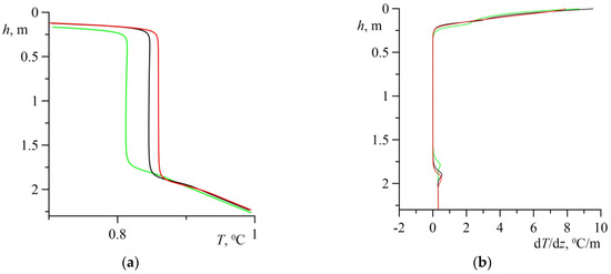 (a) Horizontally averaged temperature profiles for Variant 2 at different hours of the 5th day: green curves are 12 p.m., black—3 p.m., red—6 p.m. (b) Profiles of the averaged temperature gradients at the same time moments.