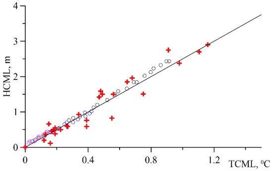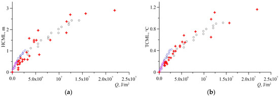 As follows from the energy balance, the heating radiative energy is utilized to raise the CML heat content (enthalpy) [31], which, in turn, is proportional to the product of the temperature TCML and depth HCML. Thus, one may expect that CML enthalpy will grow linearly with Q. The dependence of the increments in the temperature TCML and depth HCML on cumulative heating Q is more sophisticated. The corresponding results of computations are presented in Figure 8. As the curves demonstrate, both the TCML and HCML correlate with cumulative heating Q; moreover, the dependence of both these parameters on Q is practically the same for different values of radiative intensity I0. It is noteworthy that this dependence is not linear: when cumulative heating Q increased, the growth rate of the CML temperature and the deepening of its lower boundary decreased. The field observations are also presented in Figure 8; they demonstrate good correlation with the simulations.