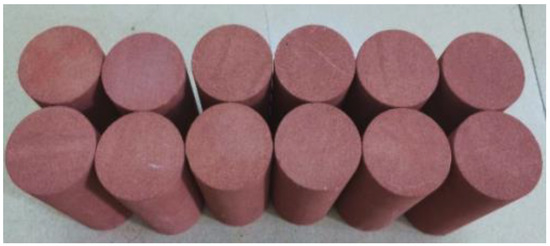 Red-bed soft rocks are sediments formed from the continental basins from the Cretaceous to the Tertiary periods in South China. The samples are dark red because they contain a certain amount of pyrite, and they are mostly conglomerates, mudstone, shale, sandstone, and so on. Because the uniaxial strength of saturated rock is usually lower than 30 MPa, these sediments are called red-bed soft rocks. The collected samples were cut into cylinders with a diameter of 50 mm and a height of 100 mm, and the samples with obvious appearance defects are removed. Then, the surface was polished smooth to make standard samples, and the ultrasonic test and weighing test were carried out. The samples with similar wave velocities and weights were selected to eliminate differences as much as possible (Figure 1).