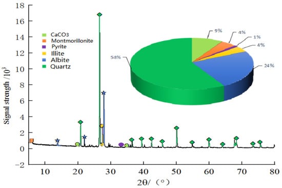 The samples are mainly composed of clastic minerals and clay minerals, including quartz, albite, calcium carbonate, montmorillonite, and illite. The XRD test was used to obtain the diffraction pattern and content of each component as shown in Figure 2. The dry density and porosity of the samples were 2.19–2.26 g/cm3 and 6.58–7.01%, respectively.