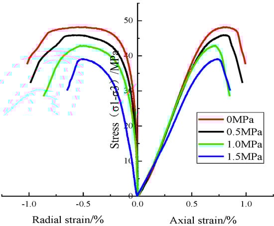 Before the experiment, the samples were placed in distilled water and forced to saturate using a vacuum saturator. The confining pressure is set at 3 MPa, and the seepage pressures are set at 0 MPa, 0.5 MPa, 1 MPa, and 1.5 MPa. At the beginning of the test, the confining pressure was applied at a loading rate of 0.05 MPa/s, and then the axial load was applied at a loading rate of 0.5 MPa/s. According to the test rules of the International Society of Rock Mechanics, the triaxial compression tests under different seepage pressures were carried out, and the stress–strain curves are shown in Figure 4.