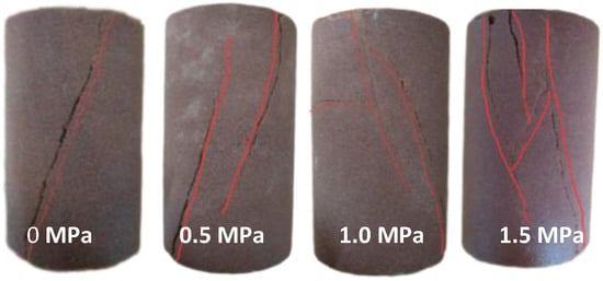 Under different seepage pressures, the triaxial stress–strain curves of the red-bed soft rock show the stages of compaction, elasticity, plastic yield, and strain softening. In the ordinary triaxial test, there is only one obvious penetrating fracture surface, and the failure mode is a compressive shear failure. When the seepage pressure is applied, the elastic modulus, strength, and maximum strain decrease with the increase in the seepage pressure, whereas the number of main cracks increases. The failure mode changes to tensile and shear conjugate failure (Figure 5).