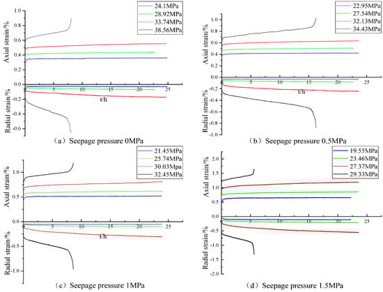 When the seepage pressure is less than 0.5 MPa, the isotropic stress–strain curves of the first- and second-grade loads are almost stable at points A and B (the variation range is less than 0.03%), and the strain is mainly caused by elastic deformation. When the third-grade loads are applied ((σ1−σ3) = 33.74 MPa), the strain begins to diverge obviously at point C. As time increases, the strain curve gradually becomes sparse, and the strain increase amplitude becomes larger. When the fourth-grade loads are applied ((σ1−σ3) = 38.56 MPa), the accelerated creep phase gradually enters at point D, and the strain increases rapidly and eventually fails. Therefore, the long-term strength can be considered to be between the third- and fourth-grade loads, corresponding to about 70% of the maximum deviator stress.