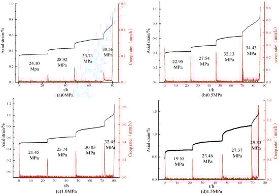 By sorting out the axial creep data of samples, the creep rate–time curve and the whole process creep curve under different seepage pressures are obtained (Figure 7).