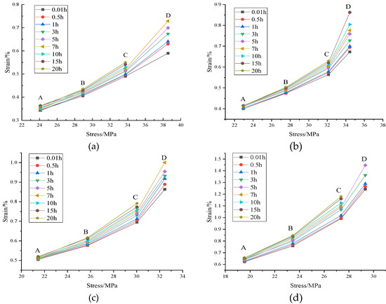 By sorting out the axial creep data of the rock samples, the isochronal stress–strain curves of red-bed soft rock under different seepage pressures are obtained (Figure 8).