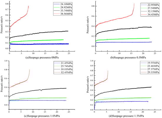 By sorting out the creep data of the rock samples, the creep Poisson’s ratio change curve of red-bed soft rock under different seepage pressures was obtained (Figure 9).\