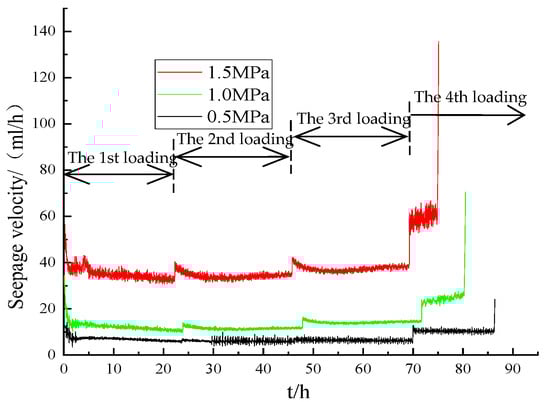 - When the seepage pressure is 0.5 MPa, the seepage velocity decreases rapidly in the first two hours and then slowly at the first-grade loads. This indicates that the pores of the sample are compressed first, and then the porosity decreases slowly. Under the second- and third-grade loads, the seepage velocity is basically constant after some adjustment, indicating no significant change in porosity.