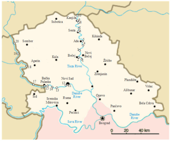 | 5 | Ada | 45° 47′ 62″ N 20° 8′ 72″ E | 15 | Čelarevo | 45° 15′ 35″ N 19° 31′ 854″ E |