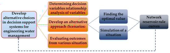 Recently, it has been discovered that a new water resource development project has a low probability of success due to its high cost and environmental effect. As a result, the management of existing water resources was adjusted in order to achieve more efficient operations [16,17]. The decision support system (DSS) is one of the solutions for the management of existing reservoirs that have been actioned and is highly beneficial at the moment. It is a technological and management integration approach, in which the obtained information can help us to understand problems and decide on management interventions [18,19,20]. It is a system that works well with unstable or semi-structured issues [21]. Because the water resource system is complicated, the factors and coherence of two reservoirs must be considered simultaneously, or the effects will be more widespread than with a single reservoir [22]. Decision support systems, which provide a breakthrough in particular for network reservoir management, are commonly used in water resource management and its interactions, such as developing a web-based open-source decision support system. DSS was developed to facilitate real-world engagement with dam-operating agencies to generate the daily optimized release decisions, resulting in significant additional hydropower benefits without compromising other objectives when compared to the conventional operation [23]. As a consequence, a decision support system is a useful tool for applying options to a given circumstance by assessing early data to aid reservoir management decision making [24,25].