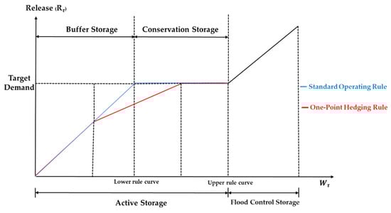 The reservoir operation model was operated under the standard operating policy, which was created following the concept of the water balance as expressed in Figure 5.