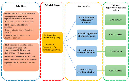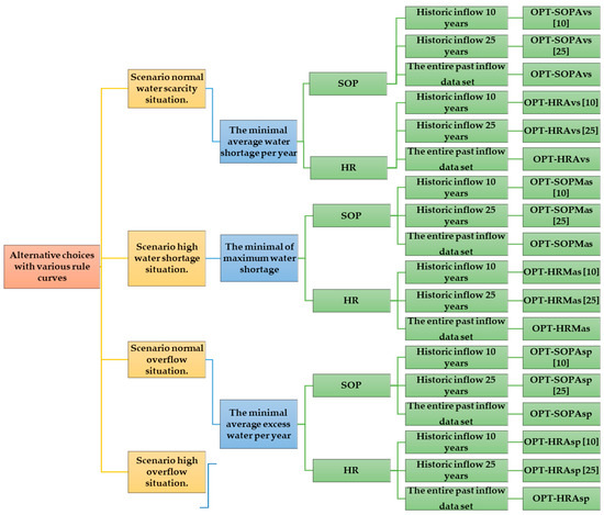 According to the obtained findings, the decisions for the best set of rule curves were made for each network reservoir decision support system, namely for the Bhumibol and Sirikit reservoirs. The most appropriate decision option was proposed for dealing with water shortage and overflow situations. As shown in detail in Figure 7, there are four application scenarios that may satisfy the decision makers’ requirements for reservoir management using the obtained rule curves. Under the SOP and HR criteria, the minimal average water shortage per year, the minimal maximum water shortage and the minimal average excess water per year were the target functions in modeling the network reservoir system.