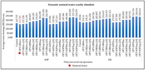 The average water shortage for each case of the rule curve are shown in Figure 8. The figure shows the rule curves that a network reservoir should decide to apply when it suffers from a water shortage problem, while a typical shortfall does not have a particularly substantial impact. Clearly, the decision makers must use the rule curves with the objective aim of obtaining the minimal average water shortage per year with the HR criterion (OPT-HRAvs) to release water with an SOP criterion in order to achieve a mean minimum water shortfall of 153.789 MCM/year.
