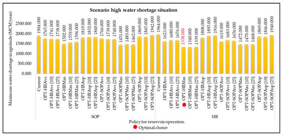 The maximum water shortage values for each rule curve are shown in Figure 9. The figure shows that when network reservoirs experience a water shortage, the adverse impact seems to be very serious. The rule curve that the reservoir should choose to apply is the rule curve with the objective aim of achieving the minimal maximum water shortage with the HR criterion (OPT-HRMas). This means that the decision makers must apply this rule curve to release water with the HR criterion threshold, which will result in the lowest maximum water shortage of 1338.00 MCM/year.