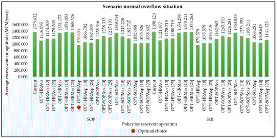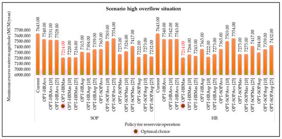 Figure 10 illustrates the average excess water for each rule curve. The figure also shows that when the network reservoir experienced an overflow problem, it was merely a normal overflow that did not have a serious impact. The rule curve that the reservoir should choose to apply is the rule curve with the objective aim of obtaining the minimal average excess water per year with the HR criterion (OPT-HRAsp). In this case, the decision maker must use the established rule curves for releasing water with the SOP release threshold, which will result in a mean minimum overflow of 978.404 MCM/year.
