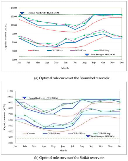 The patterns from the new rule curves created by the HHO, GA, WDO and MPA were similar as a result of the same circumstances, and all four approaches could identify the best solution in each situation to obtain the same solution. The length of the search, however, may vary, and HHO is a new technique that is easy to apply because it balances exploration and exploration. Moreover, HHO can converge to solutions faster than other techniques. In this search, a representative search technique was used, i.e., HHO [55].