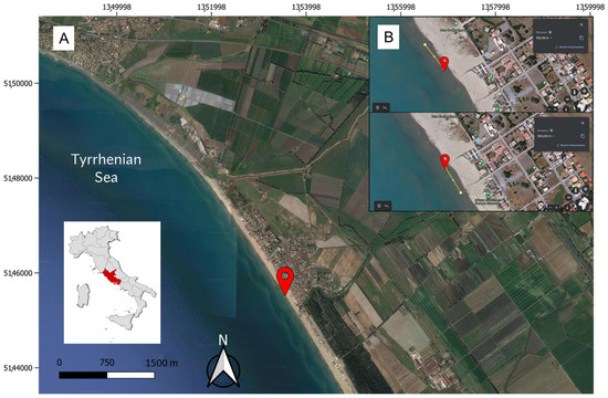 (A) Location of the sampling site along Passoscuro Beach on the Tyrrhenian Coast (Central Italy). In red, the position of Lazio Region on the Italy map. (B) Transects conducted to collect samples, 100 m north and 100 m south from the starting point.