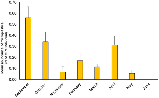 Mean abundance of microplastics (number of MPs/individual) accumulated in wedge clams sampled during each monthly sampling.