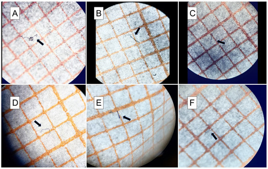 Example of microfibers found in wedge clams observed under stereomicroscope: (A–C) the largest microfibers (>1 mm), and (D–F) the smallest microfibers (<1 mm).
