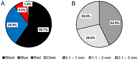 Regarding color, little variability was observed; indeed, black and blue were the most abundant color found, namely, 59.7% and 29.9%, respectively, while a small number of red MPs (9%) and transparent MPs (1.4%) was found (Figure 4A).