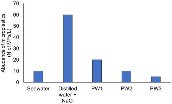 Abundance of microplastic (number of MPs/L) in different water samples: seawater, distilled water + NaCl, purged water every 3 h (PW1, PW2, PW3).