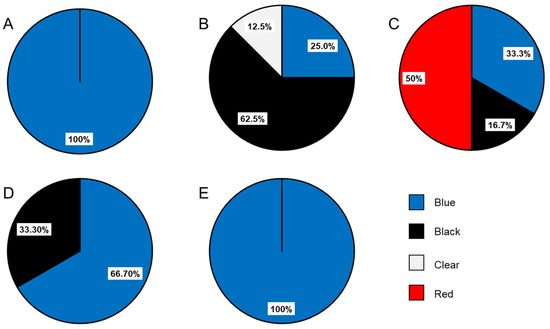 Microplastic frequency (%) of colors found in (A) seawater, (B) distilled water + NaCl, (C) purged water in 3 h, (D) purged water in 6 h, (E) purged water in 9 h.