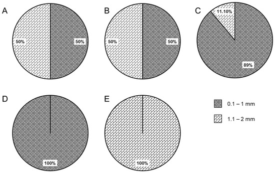 Regarding size, most MPs were in the range of 0.1–1 mm (42.8%), whereas the 1.1–2 mm and 2.1–3 mm dimension ranges were present in the same percentage (28.6%) (Figure 4B).