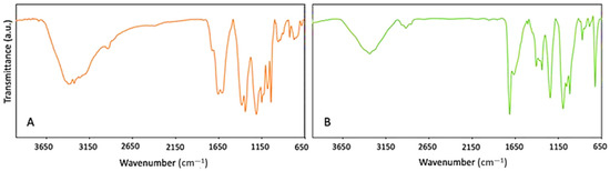 Example of micro-FTIR spectra of polymers found in wedge clams. Polyvinylidene chloride (A) and polyethylene terephthalate (B).