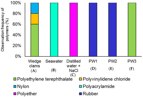 Frequency of polymers (%) identified using micro-FTIR in wedge clam specimens (A), seawater (B), distilled water + NaCl (C), purged water in 3 h (D), purged water in 6 h (E), purged water in 9 h (F).