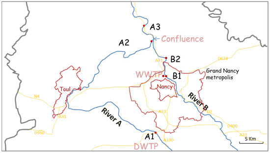 On the other hand, the studied area has a wastewater treatment plant (WWTP) and a drinking-water treatment plant (DWTP). The WWTP of Nancy is located on river B. It treats wastewater with a capacity equivalent to 300,000 inhabitants for treatment of all the wastewater of the 20 communes of Nancy city. It uses different treatments such as screening and de-oiling, as well as an innovative biolift treatment developed by NANCIE, the International Water Center. The DWTP catchment is based along river A. The water is pumped in A1 on river A.