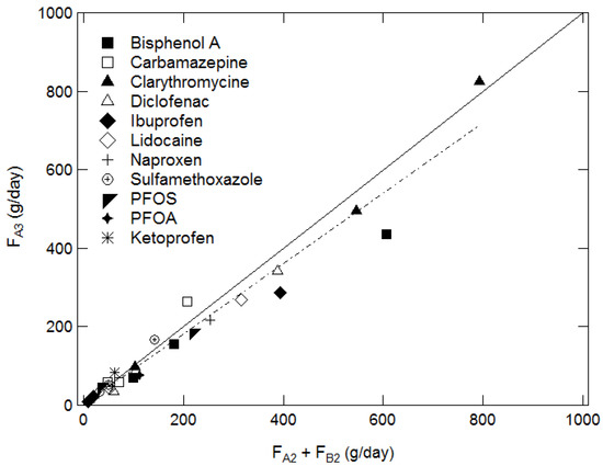 Comparison between the mass flux of micropollutant at the site A3 (FA3) and the sum of the mass fluxes at sites A2 and B2 (FA2 + FB2) for the various micropollutants. The solid line represents the perfect agreement between the mass fluxes and reads as FA3 = (FA2 + FB2). The dotted line corresponds to the fit of all the data: FA3 = 0.898 (FA2 + FB2) + 0.519 (R2 = 0.9571).