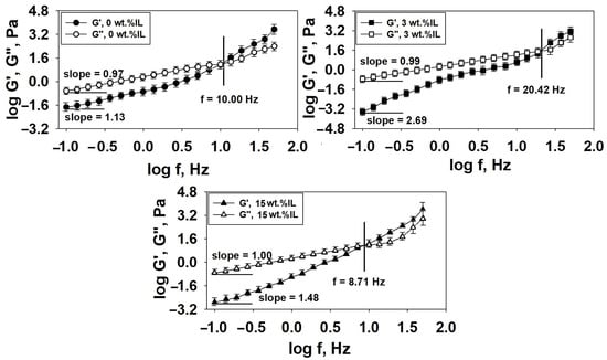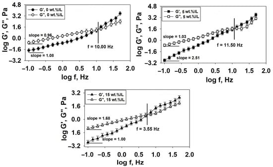 As can be observed, the curves obtained for PSFQ/ILs blends at different compositions of ILs show that in the range of low frequencies, G′ < G″, which means that a viscous behaviour prevails, while at high frequencies, the response is mostly elastic (G′ > G″). The G′ and G″ curves indicate a characteristic behaviour typical of a viscous liquid, which could be related to the polymer’s topological entanglements and association phenomena exhibited in studied systems []. Furthermore, G′ and G″ obey a power law of form, where x represents the slope values of the two moduli. For PSFQ/ILs blends in different mixing ratios, the x exponent is higher for G′ than for G″, indicating a viscoelastic behaviour. An exception occurs in the case of the PSFQ/Ph-IL blend with 15 wt.% concentration of ionic liquid, where the value of x for G′ decreases compared to that of G″, a behaviour generated by the interactions or entanglements/association among the molecules [,]. Therefore, the variation in the slope values as the content of IL changes suggests that structural transformations occur in the polysulfonic solutions.
