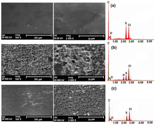 SEM images and EDX spectra of the membranes studied: (a) P0, (b) PIM-Ph 5 wt.%, and (c) PIM-Am 15 wt.%.