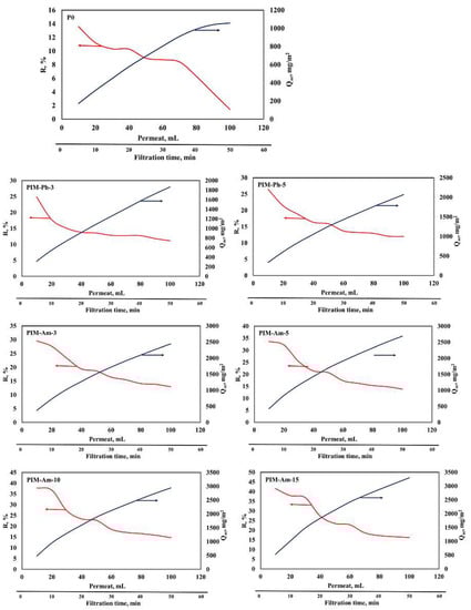 Pure water flux, percentage of water content, and overall porosity increase with increasing IL content in the membrane. Higher values of the parameters studied were obtained when using methyl trialkyl ammonium chloride (Aliquat 336) compared to membranes functionalized with trihexytetradecyl phosphonium chloride (Chyphos 101 IL). Based on the characteristics of the membranes studied, it is assumed that the membrane that will develop the best filtration efficiency will be PIM-Am-15 wt.%. The studied membranes presented a higher water flux than other studied membranes in the literature, such as: bleached and unbleached RSNF membranes (150 and 600 L/m2h, respectively) [], PES UF membrane (1643 L/m2h) [], and PEG-Ag functionalized with PANCMACDAMN (poly (acrylonitrile co maleic acid co di-amino maleio-nitrile) (1050.2 L/m2h) []. Once again, this underlines the benefit brought by ionic liquids through their incorporation into the membrane structure.