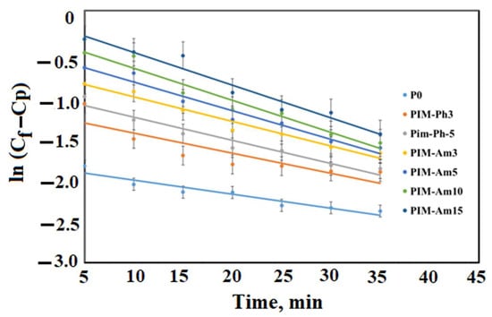 The linear dependency of ln(Cf − Cp) versus time, for all the studied membranes, is presented in Figure 7, which allowed the determination of the rate constant of the cadmium removal process from the slope. Table 2 presents the values obtained for k and for the correlation coefficients.