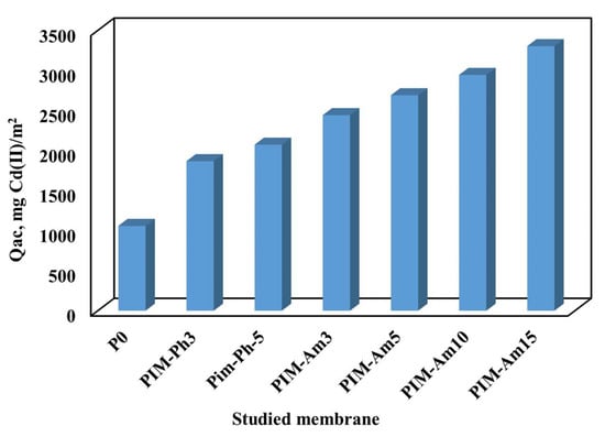 Comparing the maximum amount of Cd(II) accumulated onto the studied membrane (Figure 8), it is observed that it increases with the increase of IL content in the membrane. Membranes based on Am-IL show a higher filtration efficiency compared to membranes based on Ph-IL. These results are in accordance with the conclusions raised from the material characterization step and from the kinetic studies.