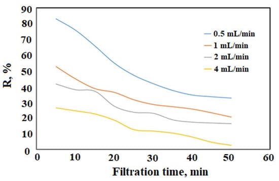 The membrane with the most efficient removal degree of Cd ions from aqueous solutions was used at different volume flows of the feed. The results are presented in Figure 9. It was observed that by applying a lesser flow and longer time of contact between the feed solutions with Cd content and the membrane, a higher removal degree of Cd ions from aqueous solutions is obtained. At each volume flow, the removal degree of Cd ions decreases with increasing filtration time. The use of a flow rate of 0.5 mL/min leads to an increase in the removal degree, but in this case it is necessary to use the filtering equipment for a long time and to treat a much smaller volume of water. This is not economically advantageous. Decreasing the flow rate from 2 mL/min to 1 mL/min does not lead to a significant improvement of the removal efficiency. Therefore, the optimum flow rate was considered to be 2 mL/min.