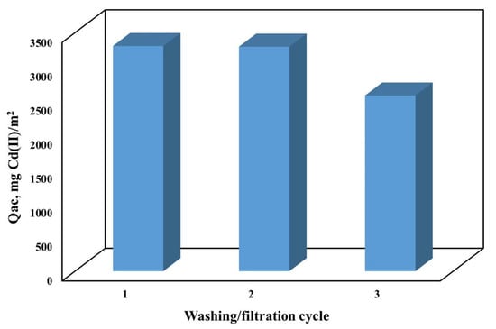 The PIM-Am15 was backwashed with distilled water using a higher pressure and used for three filtration/washing cycles. The maximum amount of Cd(II) accumulated on the membrane at different washing/filtration cycles is shown in Figure 10. It was observed that for the first two cycles, the efficiency is almost the same. In the third cycle, the efficiency decreases by 20%, probably due to inadequate removal of Cd(II) ions during the washing step.