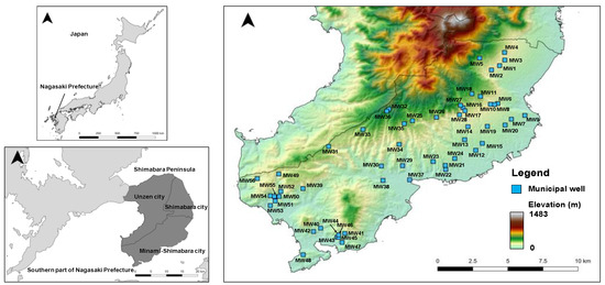 - Murakami, T. 1:50,000 Hydrogeological Maps of Japan Shimabara Peninsula, No.25; Geological Survey of Japan: Kawasaki, Japan, 1975; Available online: https://www.gsj.jp/Map/EN/environment.html (accessed on 31 October 2022). (In Japanese)