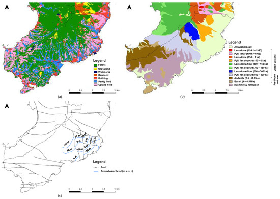 Land use and geology, (a) vegetation, (b) geology, (c) hydrogeology; (Pyfl) Pyroclastic flow. Vegetation map is based on data collected by Biodiversity Center of Japan [13]. Geological map 1/200,000 scale is based on data collected by Geological Survey of Japan [15]. Hydrogeological map is based on the groundwater investigation by Murakami [17].