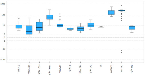 Box plots of hydrochemical components of groundwater samples. A circle is a far outlier. Starred point is a “far out” outlier.