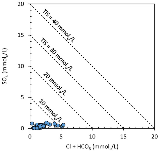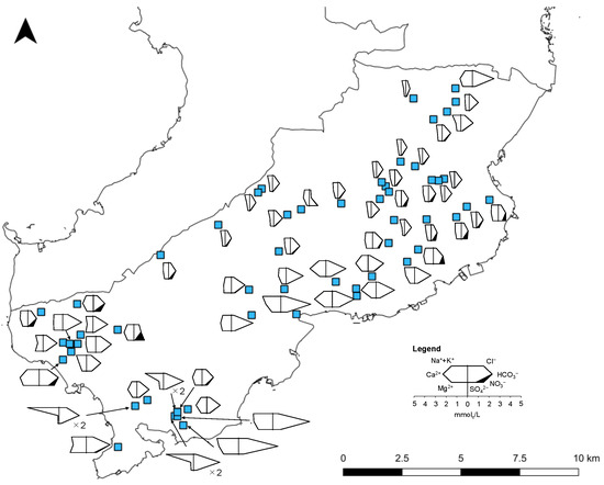 where TDS and EC are in mg/L and dS/m, respectively. TDS ranged from 47.4 to 360.3 mg/L with a mean of 134.4 mg/L. The samples were characterized by HCO3− followed by SO42−, Cl−, and NO3− for anions (Figure 3). Cations were characterized by Ca2+ and Na+ followed by Mg2+ and K+.