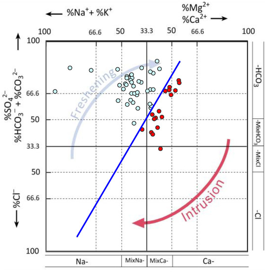 - Giménez-Forcada, E. Dynamic of Sea Water Interface using Hydrochemical Facies Evolution Diagram. Groundwater 2010, 48, 212–216. [Google Scholar] [CrossRef] [PubMed]