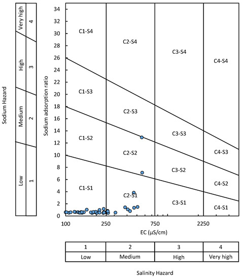 The southern part of the city has little surface water and relies on groundwater for irrigation. However, as mentioned above, groundwater with high Na+ concentrations were observed. Therefore, the suitability of groundwater for irrigation was evaluated by plotting a USSL diagram (Figure 9). The USSL diagram is drawn based on the salinity (EC) and sodium hazard (Sodium Adsorption Ratio: SAR) [34]. The SAR is calculated by [34]: