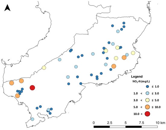 The study revealed that the extent of nitrate pollution in Minami-Shimabara City is small. In other words, NO3-N concentrations are lower than in Shimabara and Unzen Cities, and the percentage of NO3-N exceeding the standard limits is also small. The sampling campaign was between July and August when rainfall amount was large. In the investigations conducted during this period, a decrease in nitrate concentration was observed in Shimabara City due to dilution caused by rainfall [8,10]. Therefore, future surveys are needed at different seasons. It is also necessary to introduce analysis of nitrogen oxygen stable isotopes of NO3− to clarify the nitrate source.