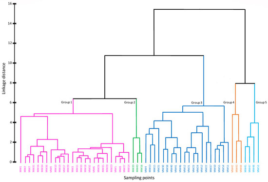 Dendrogram for groundwater samples divided into five groups.