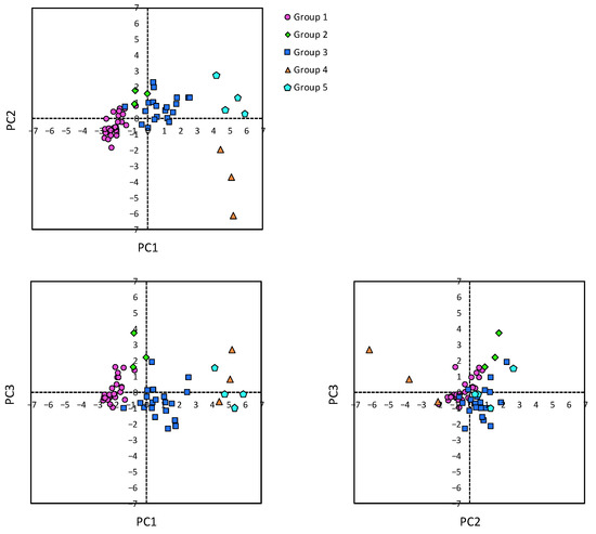 Scatter plots for PC1, PC2, and PC3.