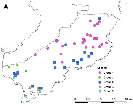Results of the HCA are shown in Table 5 and Figure 11. The 56 groundwater samples were classified into five groups, with the number of samples in each group ranging from 3 to 26. Figure 12 shows the scatter plot of the principal components related to groups. PC1 effectively separated groups, meaning that dissolved constituents are different for each group. Group 1 shows relatively low scores for PC1, indicating lower dissolved constituents. Mainly the sampling points indicated by smaller Stiff diagrams in Figure 6 are contained in this group. Group 1 is distributed from the center to east in the study area. Group 2 and 3 has similar scores of PC1 and PC2, representing intermediate ion concentrations. However these groups are be distinguished by PC3, meaning that nitrate pollution level are different for these groups. As shown in Table 5, water samples having higher NO3− concentrations were classified into Group 2. The difference between Group 2 and 3 is characterized by difference in locality (Figure 13). Group 2 is located in the western part of study area, while Group 3 is mainly located at lower altitude along the coastal line. PC1 and PC3 of Group 4 is similar to that of Group 5, but these groups are clearly distinguished by PC2. In other words, Group 4 has relatively high negative scores for PC2, indicating negative effects of ion exchange, and anthropogenic activities. Group 4 is associated with deep groundwater with high concentrations of sodium and bicarbonate ions (Table 5). The five groups can be generally summarized in three categories.PC1 and Figure 11 show that Group 4 and 5, which are characterized by high ion concentration especially Na+ and HCO3−, are different from the other groups. Based on overall ion concentration including nitrate, the remaining groups can be categorized by either intermediate ion concentration (Group 3) or lower ion concentration (Group 1 and 2).