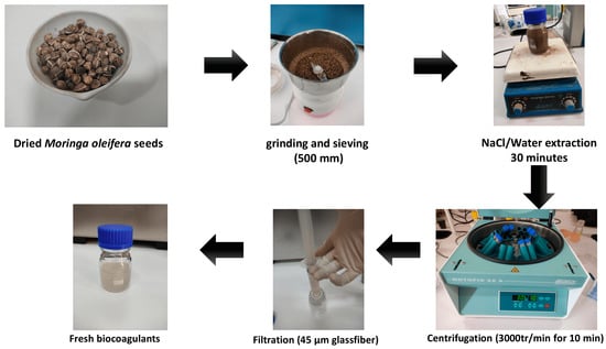 MO was purchased in a local herbal market. Seeds that were not deteriorated, old, or contaminated with seed pests were selected. They were further dried for 24 h at 40 °C in an oven (Memmert GmbH + Co.KG, Bavaria, Germany), then ground into powder using a domestic blender. The obtained powder is referred to as MOP. A saline extraction was performed according the method described earlier [18]; the resulting mixture is referred to as MOPS. An aqueous extraction was also undertaken for comparison purposes (MOPW). Preweight MOP was blended with 100 mL of distilled water (DW) [27], and both solutions were freshly prepared for each set of experiments to prevent degradation or alteration of the biocoagulant properties (Figure 1).